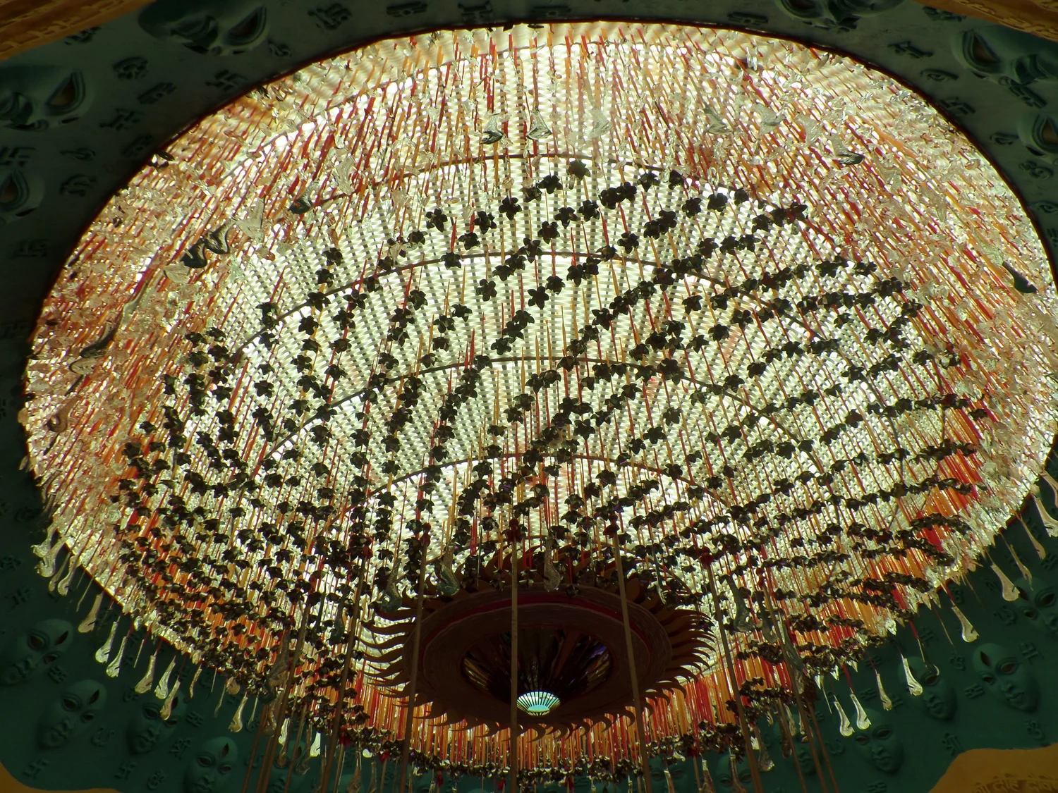Ceiling of the pandal illuminated with the glazing trishul, chakras and kharas of devi Durga.
